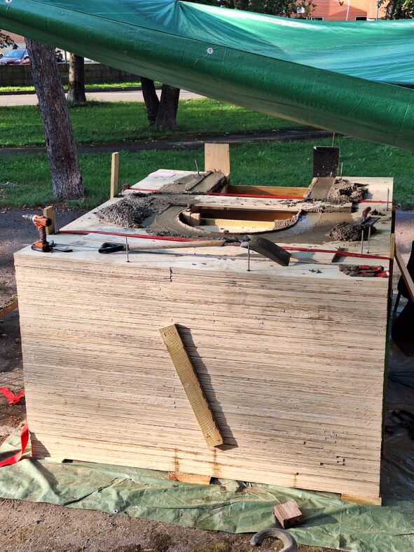 The production of “Tuhast” faced two distinctive challenges, which required extensive research, collaboration and experimentation. The first challenge was the production of the casting mould, which is meant to reproduce the exterior form of a shale-rock formation. Inspired by the works and experimentation of Maya Lin, A. Labašauskas, P. Zumthor and Walter Jack, Augustas Lapinskas proposed a novel casting technique which was tested and developed through experimentation at Narva Art Residency, with technical assistance of A. Sprindžiūnas.While it is a commonly used technique in architecture to use wooden casting moulds for concrete to achieve a wood-like texture, Lapinskas’ process makes a significant departure. In this case, varying shapes cut out of plywood sheets were stacked, assembled, and finally burned to create a highly detailed distressed surface. The resulting wooden cast mimics the organic cracked shardlike texture of shale-rock.