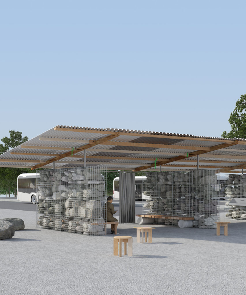 “No Time to Waste” focuses on the act of killing time and providing shelter by creating a structure that uses repurposed, reused resources but also makes the time worth spending while waiting. The pavilion features a series of walls that define a sequence of covered and permeable rooms that are open for future developments.