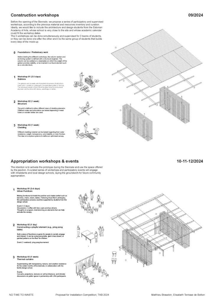 Workshops focused on building and activating the pavilion will involve architecture and design students from the Estonian Academy of Arts.From August to October 2024, a 1:1 fragment of “No Time to Waste” will be built at Balti Jaam, Tallinn’s busiest local transportation hub, and will inaugurate on October 11th, 2024 during Tallinn Architecture Biennale 2024 opening week.